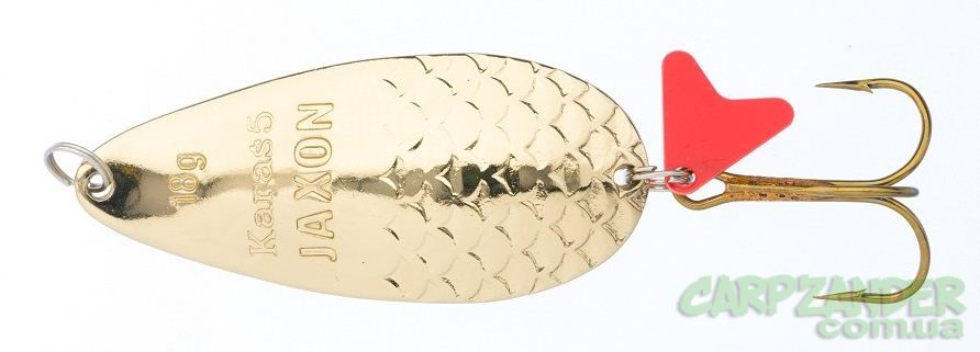 Блесна Jaxon Karas Classic может иметь один из трех цветов – Cuprum (медь), Silver (серебро) и Gold (золото). Однако даже стандартные приманки польский изготовитель не мог оставить без собственных нововведений. Пластинка на кольце вместе с тройным крючком имеет форму рыбьего хвоста и исполняет сразу несколько функций. Во-первых, несколько редактирует частоту и привлекательность колебаний блесны. А, во-вторых, создает визуальный эффект кровоподтеков. Последнее должно ввести хищника в заблуждение, убеждая в том, что перед ним находится раненая добыча, не способная к активному сопротивлению или продолжительной погоне. Благодаря такому качеству блесна Jaxon Karas Classic способна привлекать даже габаритных хищников, в том числе щук, затаившихся на нижних горизонтах водоемов. Приманка имеет детально выточенные ложбинки, повторяющие чешуйки, которые создают дополнительную игру света.