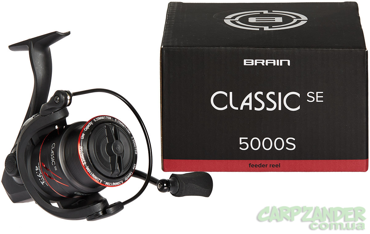 Котушка Brain Classic SE – оновлена модель для фідерного лову. Вона відрізняється високою потужністю та надійністю при збереженні невеликої вартості, що робить її дуже популярною серед рибалок. Деякі навіть сміливо використовують цю котушку для спінінга, коли тягові характеристики снасті виходять на перший план. Classic SE оснащена простим, але перевіреним механізмом, який налічує 4 шарикопідшипники та 1 роликовий підшипник, що відповідає за моментальний стопор зворотного ходу. Він надійно зафіксований у графітовому корпусі, який до того ж має невелику масу. Алюмінієва шпуля з переднім скошеним бортиком має низький профіль, що зроблено для того, щоб позбавити рибалку від використання бекінгу. Зафіксувати дистанцію лову допоможе кругла металева кліпса із пластиковою підкладкою, що захищає шнур від пошкоджень. У котушці використано металеву ручку, яка вкручується у вісь ведучої шестерні, що позитивно впливає на надійність цього вузла кріплення.