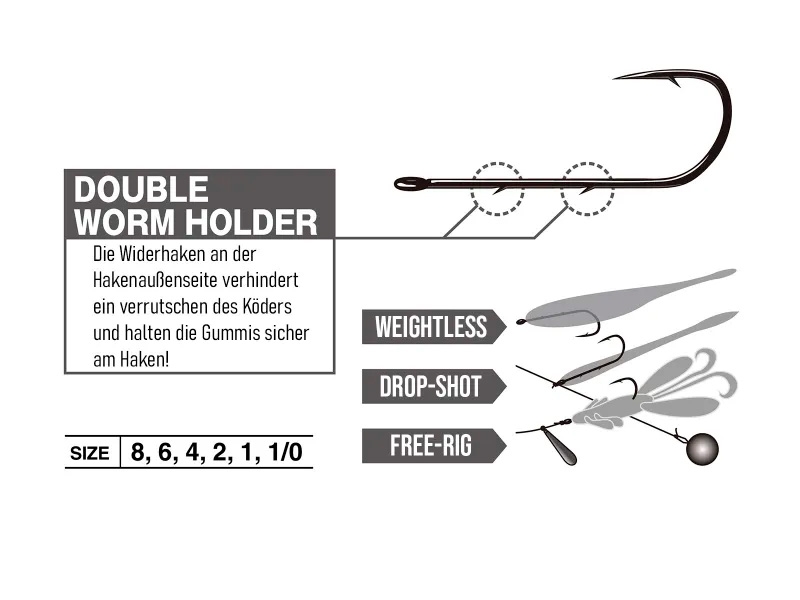 На цевье крючка расположены две небольшие фиксирующие бородки, которые предотвращают сползание мягкой приманки или червя при забросе и проводке. Благодаря такой конструкции крючок особенно удобен при использовании с гибкими джиг-головками, в Drop Shot оснастке, а также в других finesse-риг монтажах.