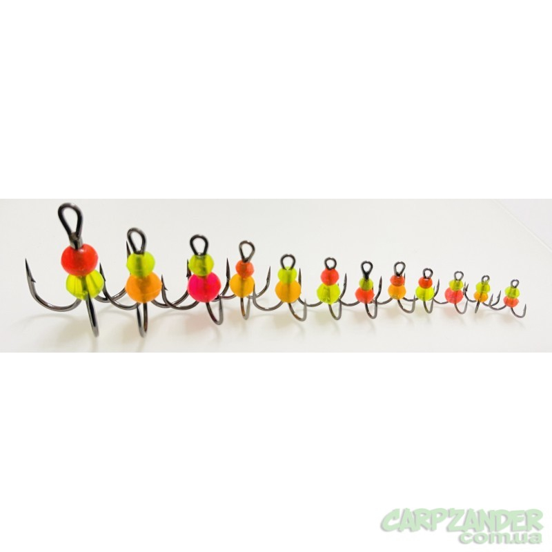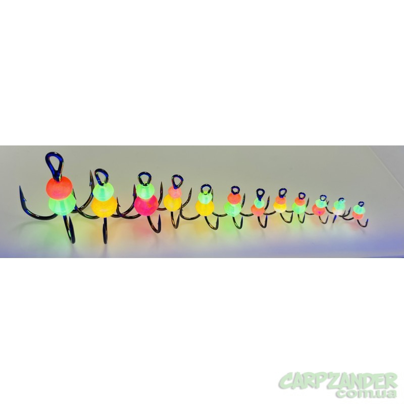 Потрійний гачок оснащений флюоресцентними намистинами, що нагадують ікру риби і мають власне яскраве світіння в ультрафіолеті помаранчевого, червоного і зеленого кольору. Не замінимо в оснащенні зимових блисок, снасточок і балансирів.
