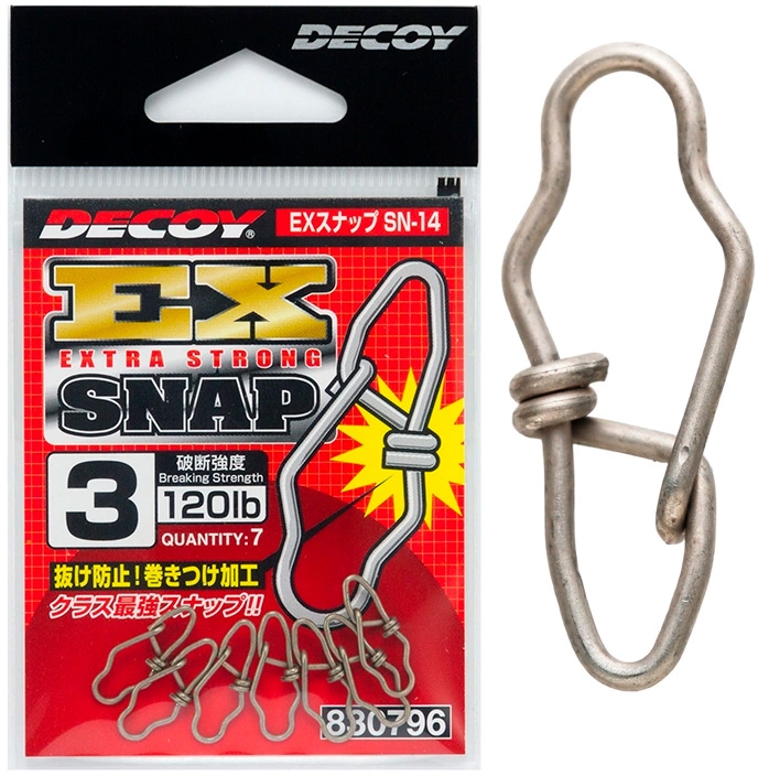 Decoy SN-14 Ex Snap — это высокопрочная рыболовная застёжка, разработанная для серьёзных нагрузок при ловле морского хищника с берега, а также для охоты за крупной пресноводной рыбой. Модель создана с упором на максимальную надёжность, устойчивость к деформации и безопасность оснастки в экстремальных условиях.