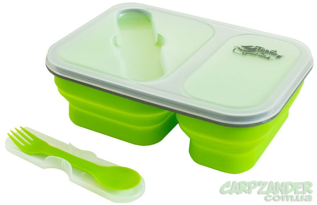 Контейнер Tramp складний силіконовий 2 відділи з кришкою клямкою зелений 900ml (з ложкою-вилкою)