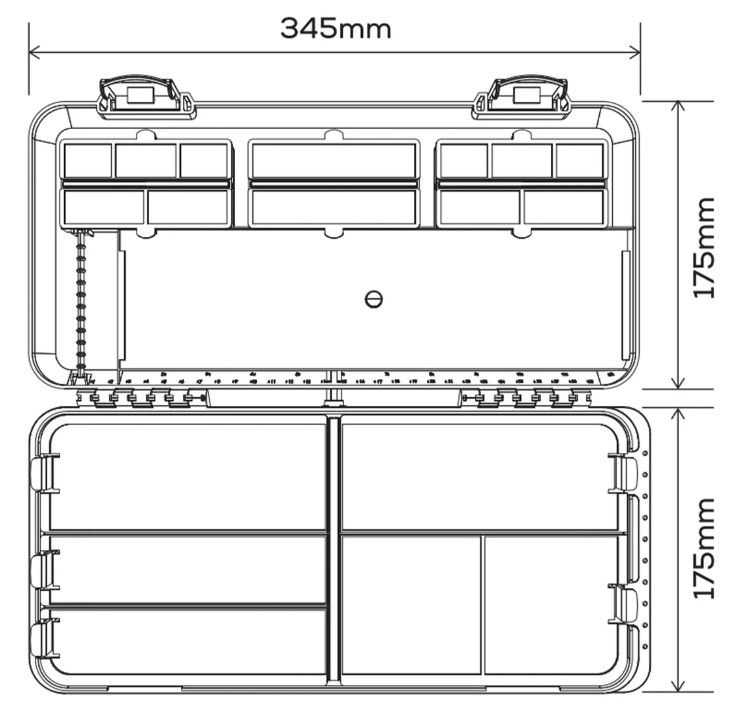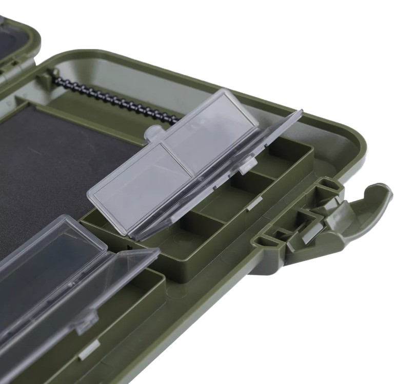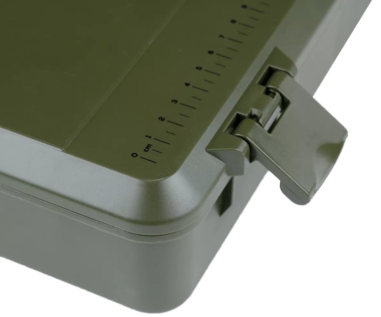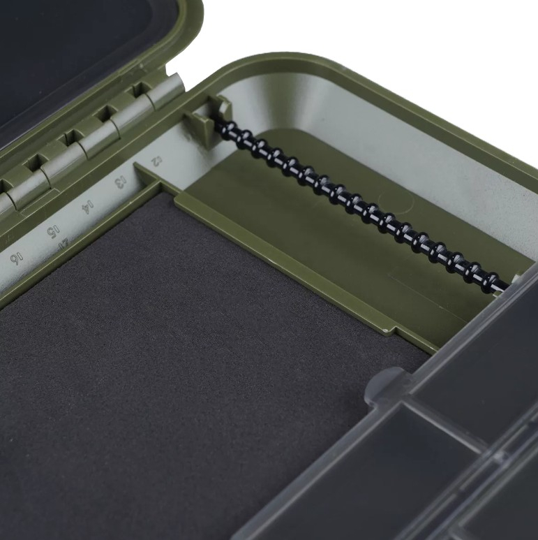 Комірки під прозорими кришками розділені на декілька блоків, що дозволяє швидко знайти необхідні елементи оснащення. Вбудована повідочниця з комплектом булавок для фіксації та лінійка на кришці коробки полегшують процес виготовлення та зберігання повідців.