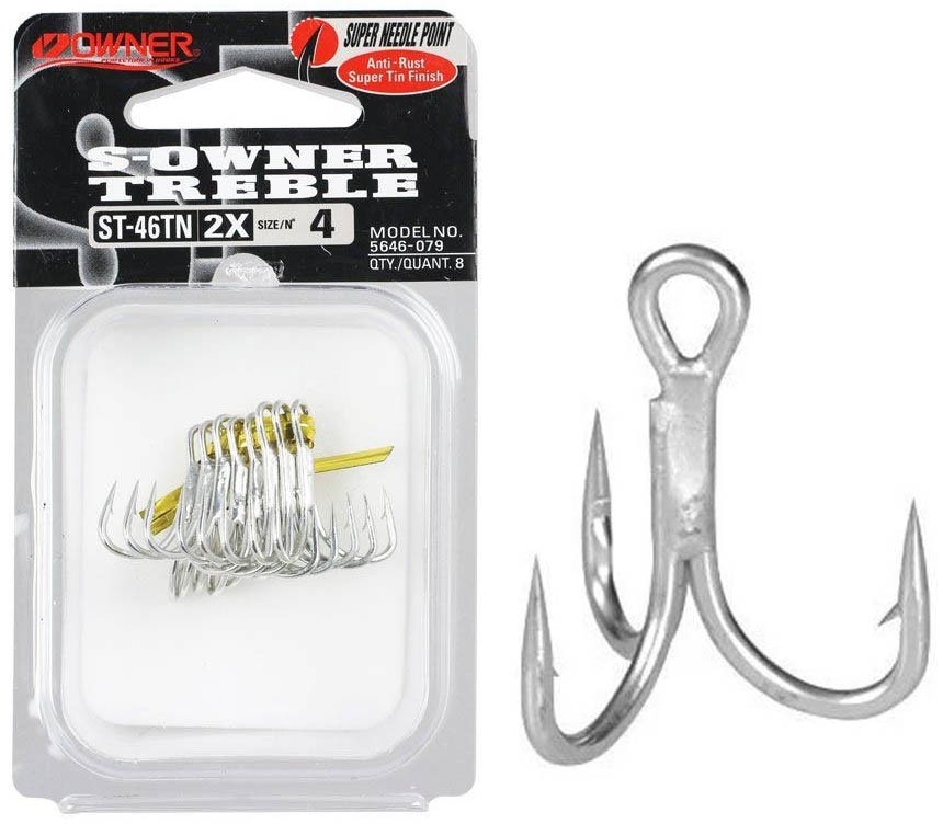 Owner ST-46TN – універсальні потрійні гачки з округлим загином і прямим жалом, ідеально підходять для оснащення штучних приманок. Виготовлені з високовуглецевої сталі та покриті антикорозійним шаром, що забезпечує довговічність і стійкість до впливу прісної та солоної води.