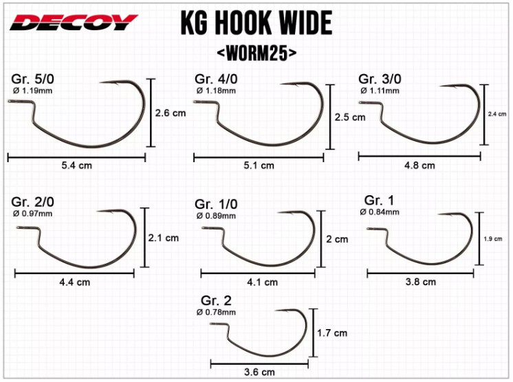 Hook Wide Worm25 - спеціальна серія гачків, які розраховано на використання приманок форми «шед». Відмінною рисою цієї серії служить досить широкий піддів і глибокий загин цівки. Завдяки такій формі, приманка добре тримається на гачку, а при клюванні гачок моментально звільняється і просікає пащу риби. Рекомендовано для використання на всіх видах монтажів.