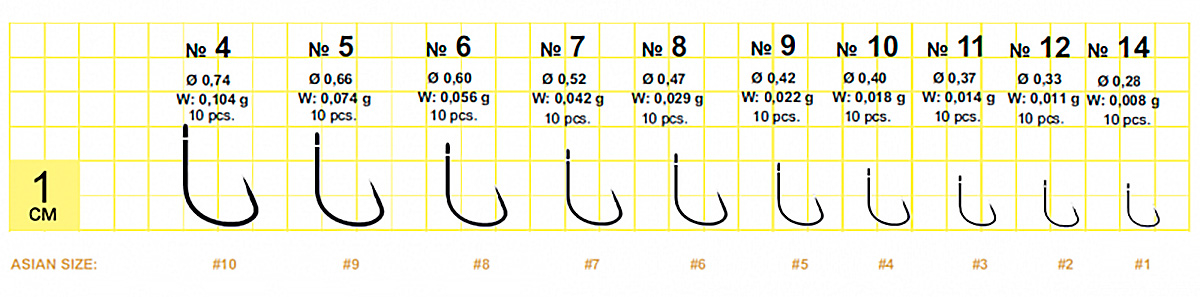 | № EU | Код каталогу | Діаметр дроту, мм | Вага гачка, г | К-сть гачків |