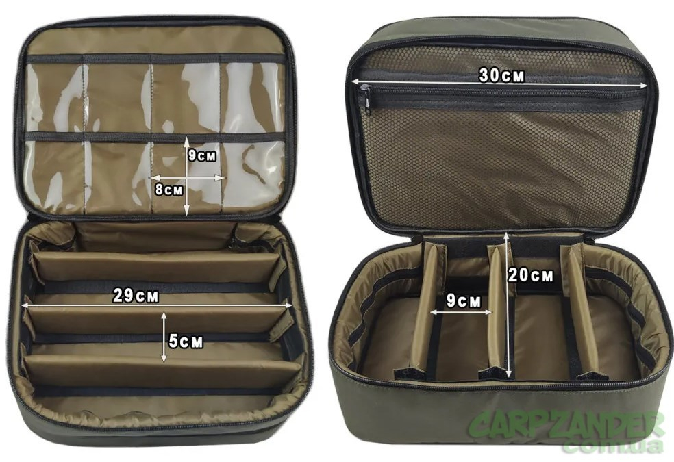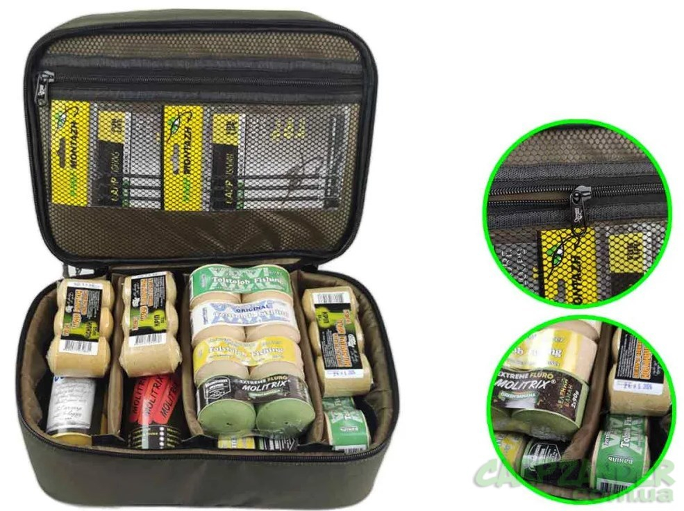 Сумка Double Bag для технопланктона и монтажей на толстолоба состоит из 2 больших отсеков-ярусов. Нижний отсек лучше всего подходит для технопланктона и состоит из 4 ячеек отделенных съемными перегородками, дополнительно есть большой карман на сетке. В верхнем отсеке удобно разместить готовые монтажи и технопланктон до 70-90г в таблетке. Он также состоит из 4 ячеек отделенных съемными перегородками. На крышке сумки предусмотрено 8 прозрачных карманов для крючков и фурнитуры. Каждая перегородка фиксируется на 3 точках крепления поэтому надежно удерживает состав каждой ячейки.